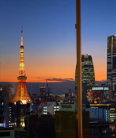 Welcome to your getaway above the city. As you step into our 16th-floor lobby, you'll be greeted by panoramic views of Tokyo that stretch as far as the eye can see. Leave behind the bustle of Ginza and stretch your legs in a chic space with ever-changing scenery. Every guest room boasts large windows offering breathtaking night views of the glittering skyline—perfect for creating unforgettable memories.