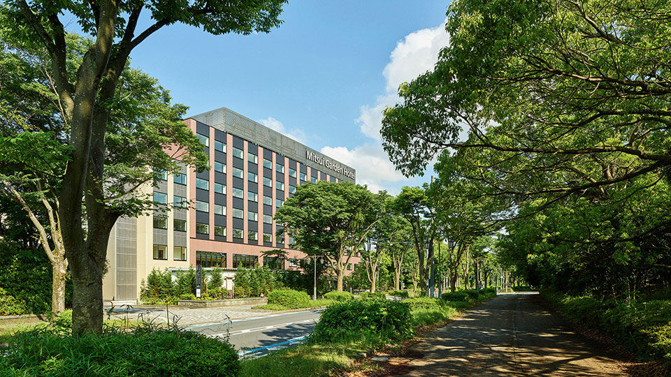 三井ガーデンホテル柏の葉パークサイドの目の前には、新緑の美しい柏の葉公園が広がっています。鎧かぶとの装飾も鮮やかなグリーンカラーに。