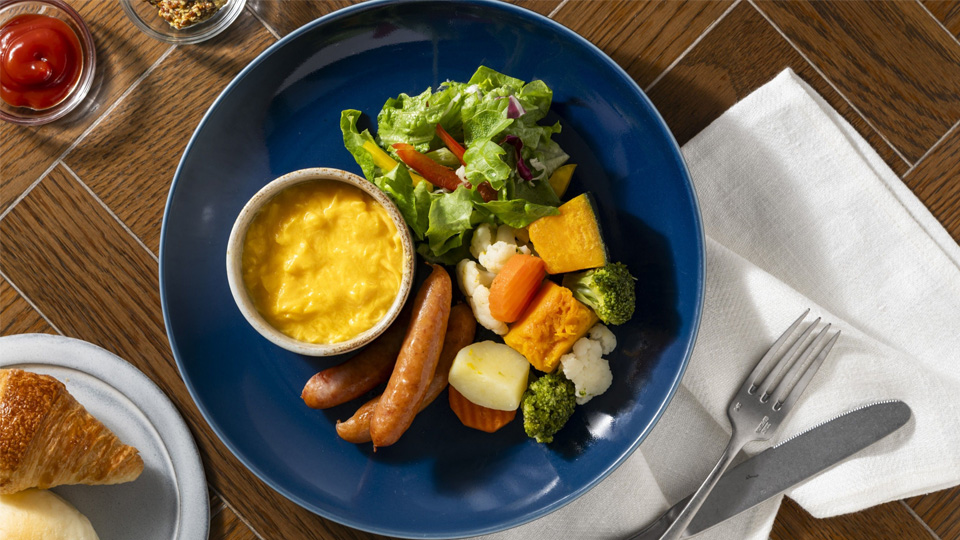 달걀 요리, 소시지, 베이컨, 수프 같은 따뜻한 음식을 미니 뷔페 스타일로 제공합니다.